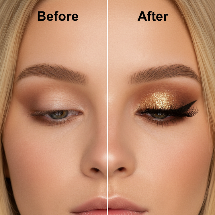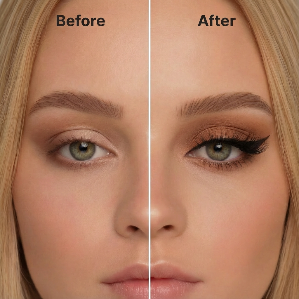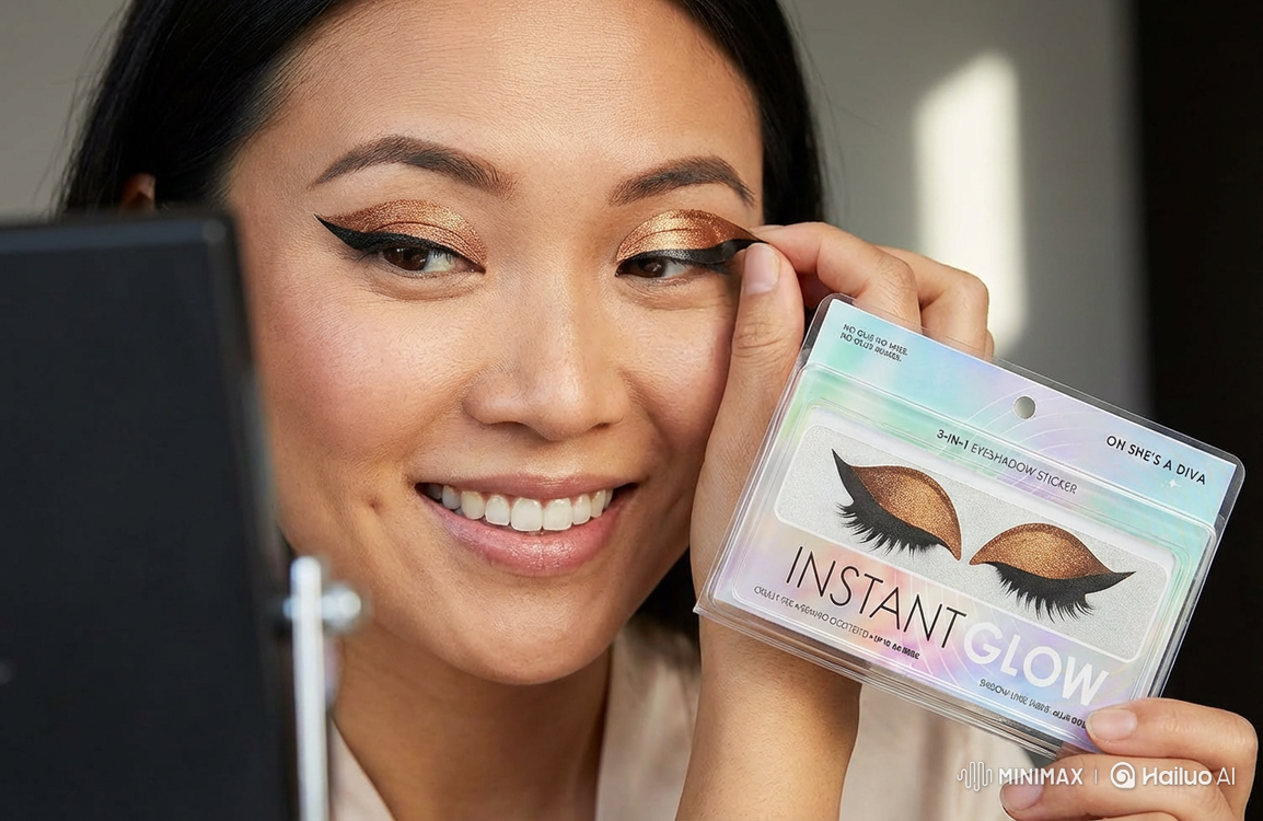 See how InstantGlow transforms bare lids into bold, defined eyes and voluminous lashes in seconds. No glue, no brushes—just peel, press, and go.